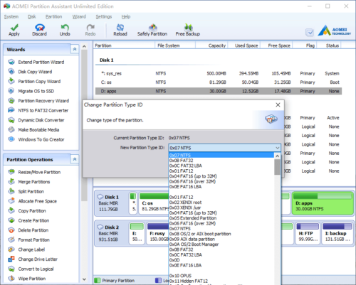 Step1, launch the program, right click the partition you want to change type ID and select “Advanced” > “Change Partition Type ID”.
