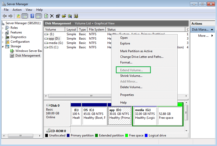 Microsoft added “Shrink Volume” and “Extend Volume” feature in Disk Management console from Windows Server 2008, with which you can do some advanced partitioning operations. For example, you can use “Shrink Volume” to release some unused space from a partition and create new drives with the unused (Unallocated) space. If there is adjacent Unallocated space behind a partition, you can extend this partition via “Extend Volume”.